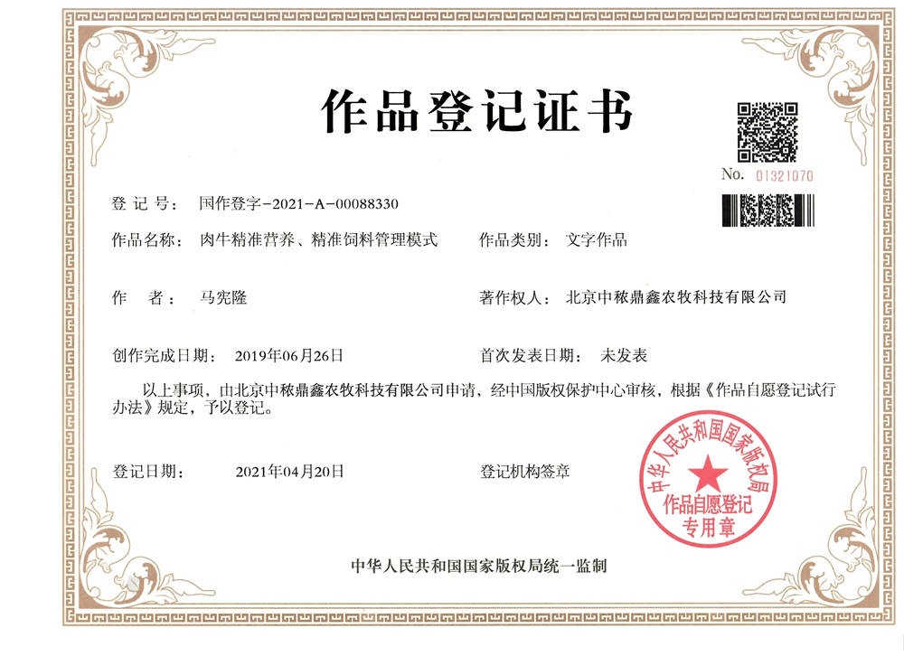 肉牛精準(zhǔn)營(yíng)養(yǎng)版權(quán)登記證書